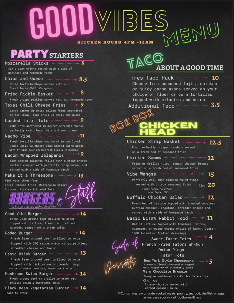 Good Vibes Bar Billiards Eatery offers amenities such as Wheelchair Accessible, Outdoor Dining, Outdoor Parking, Parking Lot, Full Bar, Designated Smoking Areas, Accepts Contactless Payments, Wheelchair Accessible, Outdoor Dining, Outdoor Parking, ensuring a comfortable and convenient experience for clients.